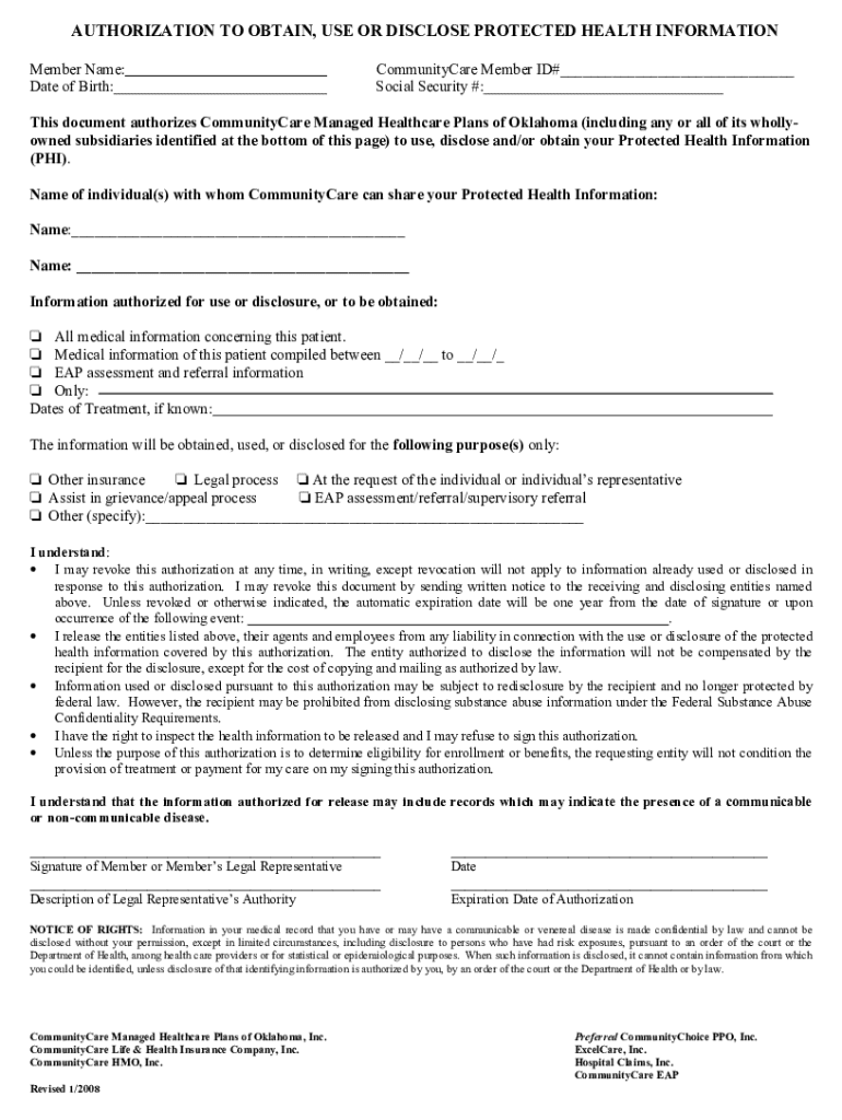 Este documento autoriza a CommunityCare Managed Healthcare Plans de Oklahoma a usar, divulgar y/o obtener su Información de Salud Protegida (PHI). Incluye la identificación de individuos permitidos para compartir PHI, el tipo de información autorizada y los propósitos para los cuales se usará la información.
