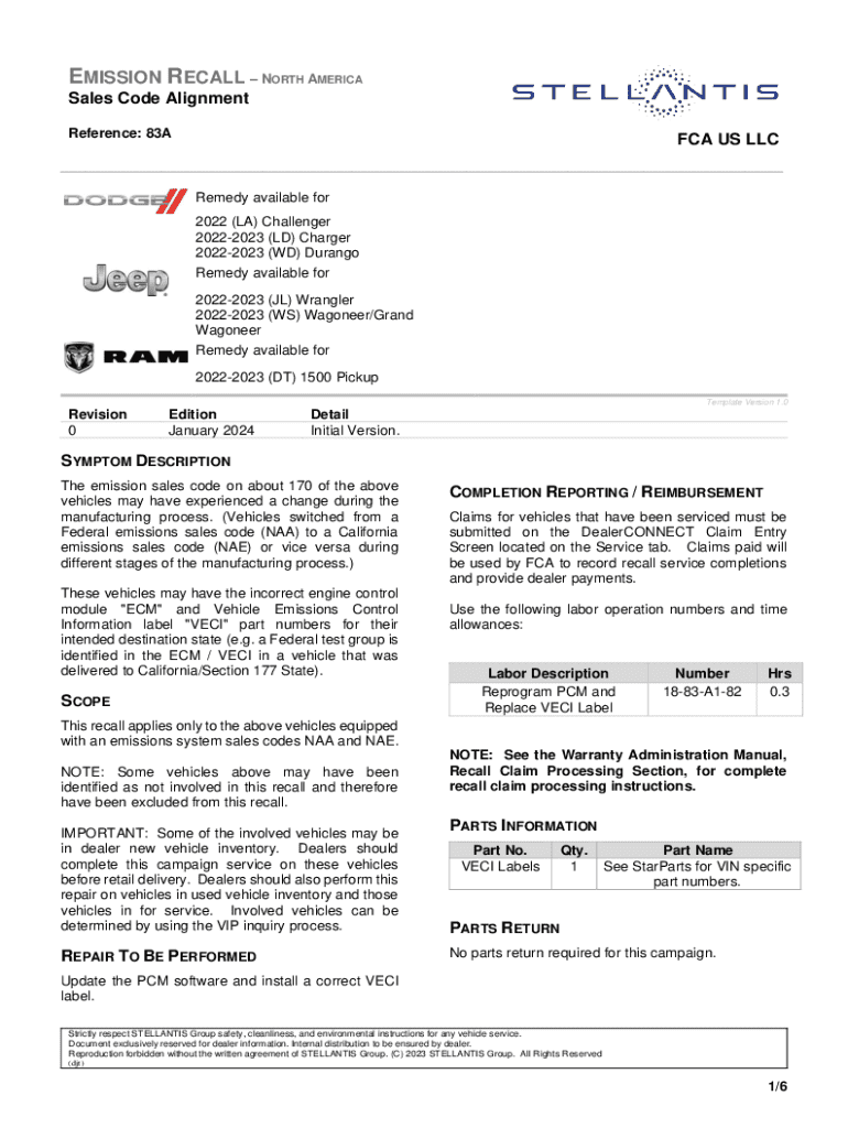This document outlines the emission recall process for various FCA vehicles, detailing the identified issues with emission sales codes, necessary repairs, and procedures for the involved dealers and vehicle owners.