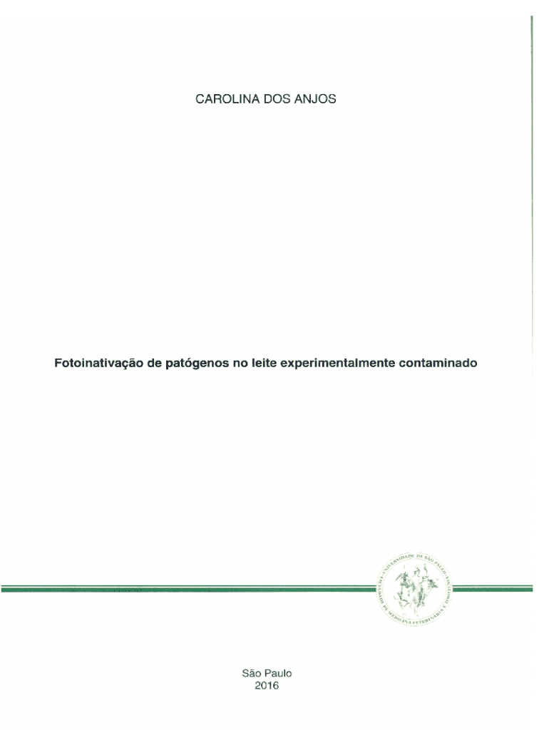 ISlenldUCIIV\"t\' TliCAROLINA DOS ANJOSFotoinativao de patgenos no leite experimentalmentecontaminado...,So Paulo 2016\'\"lO(1)1:CAROLINA DOS ANJOSFotoinativao de patgenos no leite experimentalmente contaminadoDissertao apresentada ao Programa de PsGraduao em Clnica Veterinria da Faculdade de Medicina Veterinria e Zootecnia da Universidade de So Paulo para obteno do ttulo de Mestre em Cincias Departamento: Clnica
