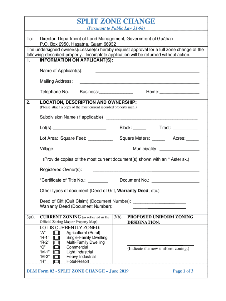 This document is a request for approval of a full zone change for a specified property in Guam, serving as an application form to be submitted to the Department of Land Management. It includes sections for applicant information, current and proposed zoning designations, required signatures, and official use sections.