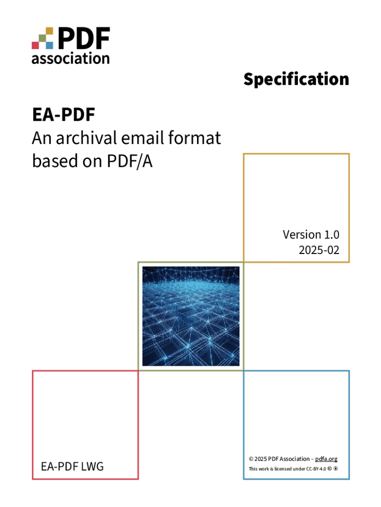 Este documento define una especificación y mejores prácticas para un formato de archivo de correo electrónico de archivo neutral a proveedores y plataformas, basado en PDF/A, conocido como EA-PDF, para la preservación a largo plazo de correos electrónicos. El formato de archivo es compatible con PDF/A-3 o PDF/A-4 y establece un vínculo verificable entre los activos de correo electrónico originales y la representación en PDF de esos correos.