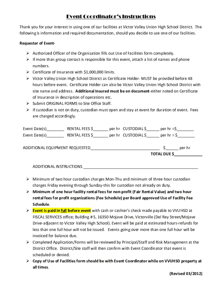 This document provides instructions and information for organizations wishing to use facilities at Victor Valley Union High School District. It outlines the necessary documentation, fees, and procedures