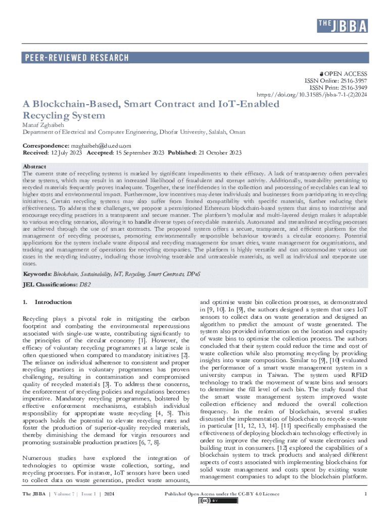 PEERReviewed RESEARCH OPEN ACCESS ISSN Online: 25163957 ISSN Print: 25163949 https://doi.org/10.31585/jbba71(2)2024A BlockchainBased, Smart Contract and IoTEnabled Recycling System Manaf Zghaibeh Department of Electrical and Computer Engineering, Dhofar University, Salalah, Oman Correspondence: mzghaibeh@du.edu.om Received: 12 July 2023 Accepted: 15 September 2023 Published: 21 October 2023Abstract The current state of recycling systems is marked by significant impediments to their efficacy