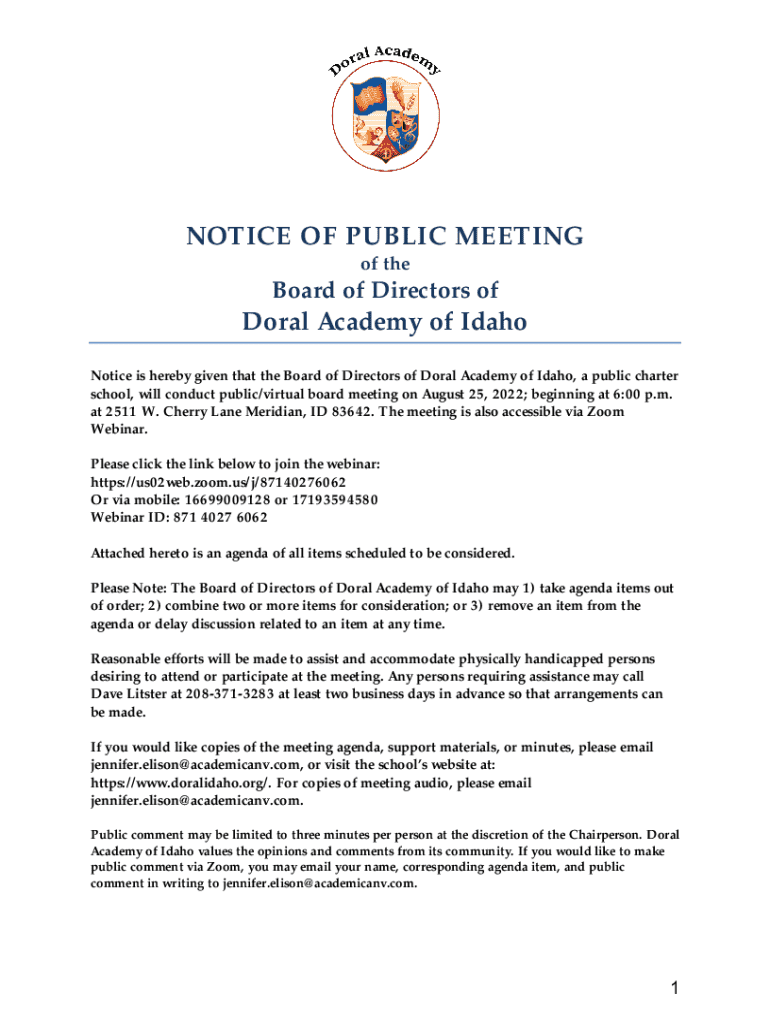 NOTICE OF PUBLIC MEETING of theBoard of Directors ofDoral Academy of Idaho Notice is hereby given that the Board of Directors of Academy of Idaho, a public charter school, will conduct public/virtual