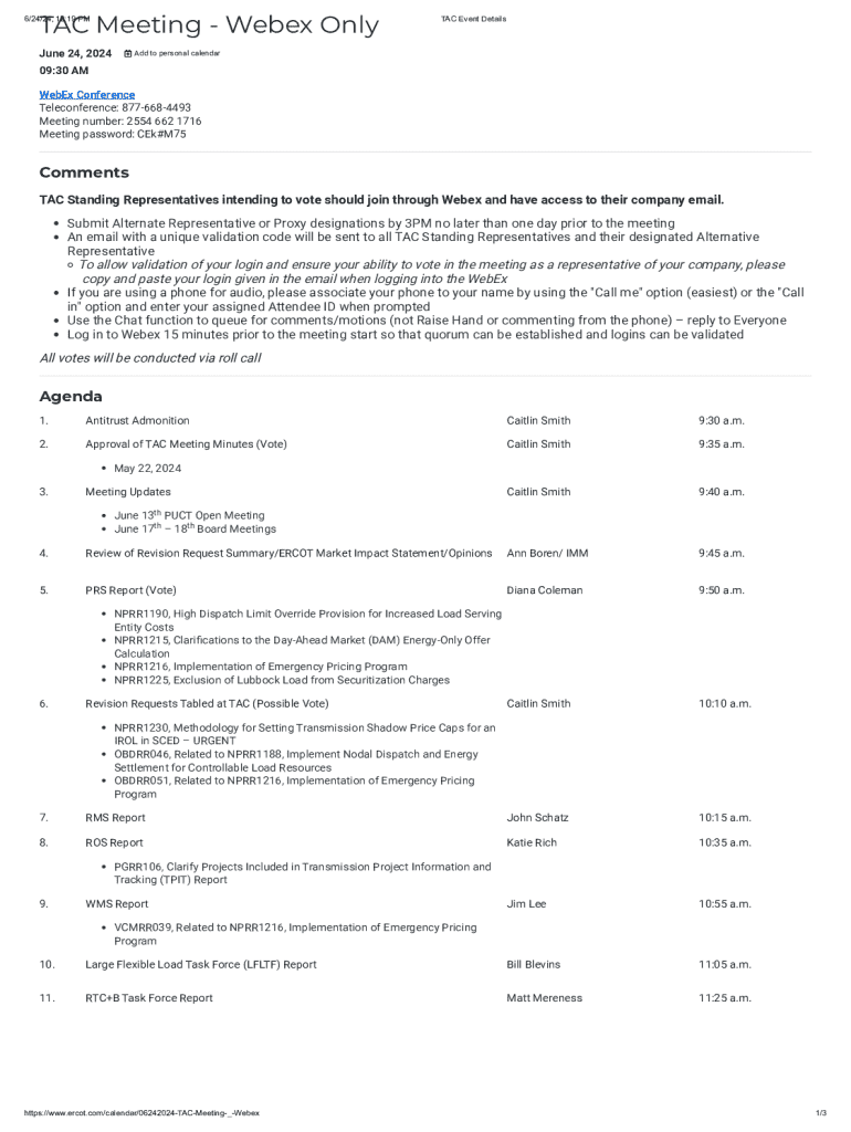Details regarding the TAC meeting scheduled for June 24, 2024, conducted via Webex, including agenda items, voting procedures, and contact information.