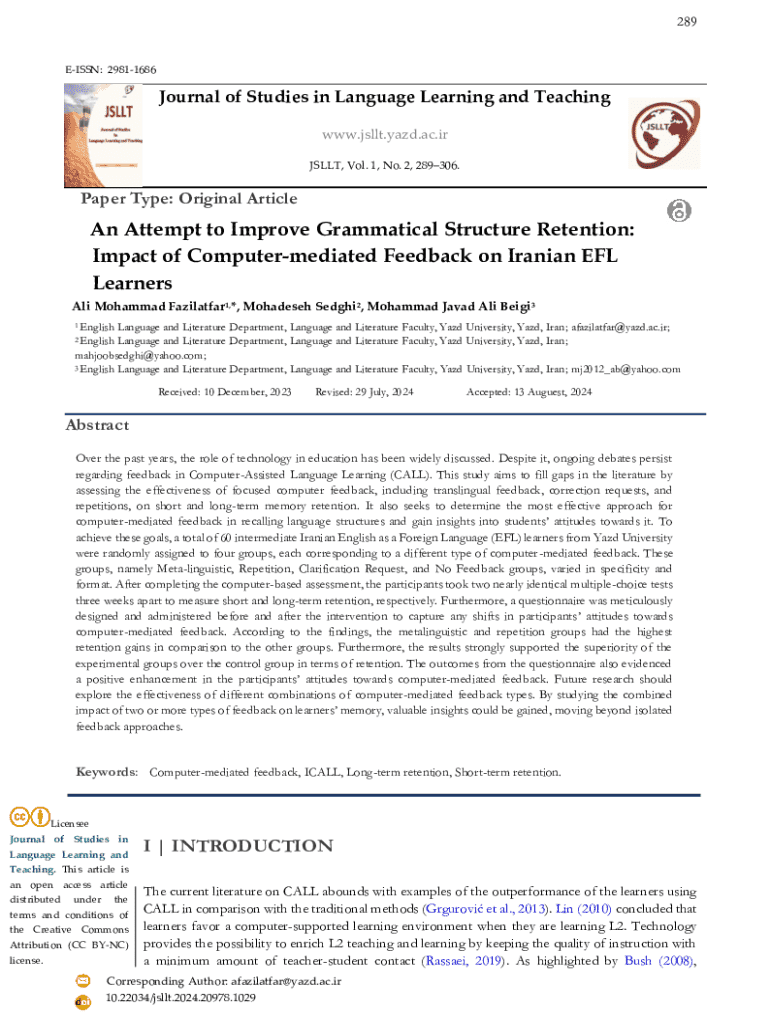 289EISSN: 29811686Journal of Studies in Language Learning and Teaching www.jsllt.yazd.ac.ir JSLLT, Vol. 1, No. 2, 289306.Paper Type: Original ArticleAn Attempt to Improve Grammatical Structure Retention: Impact of Computermediated Feedback on Iranian EFL Learners Ali Mohammad Fazilatfar1,*, Mohadeseh Sedghi2, Mohammad Javad Ali Beigi3 1 EnglishLanguage and Literature Department, Language and Literature Faculty, Yazd University, Yazd, Iran; afazilatfar@yazd.ac.ir; Language and Literature
