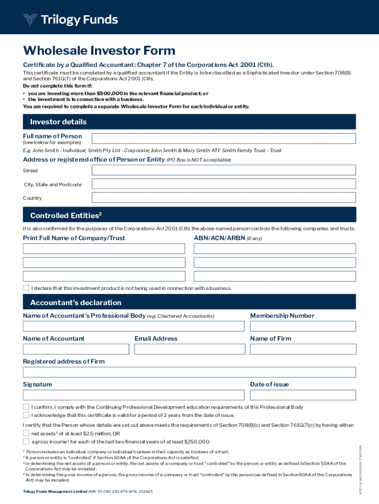 To fill out the wholesale investor form, one must provide personal information, details about their financial situation, and any supporting documentation that verifies their status as a wholesale investor as per regulatory requirements.