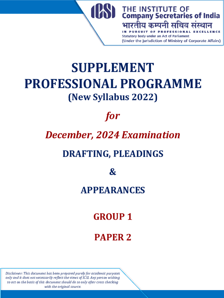 SUPPLEMENT PROFESSIONAL PROGRAMME (New Syllabus 2022)for December, 2024 Examination DRAFTING, PLEADINGS & APPEARANCES GROUP 1 PAPER 2Disclaimer: This document has been prepared purely for academic purposes only and it does not necessarily reflect the views of ICSI. Any person wishing to act on the basis of this document should do so only after cross checking with the original source.IndexS. No.LessonPages1Lesson 4: Drafting of Agreements, Deeds and Documents232Lesson 5: Drafting