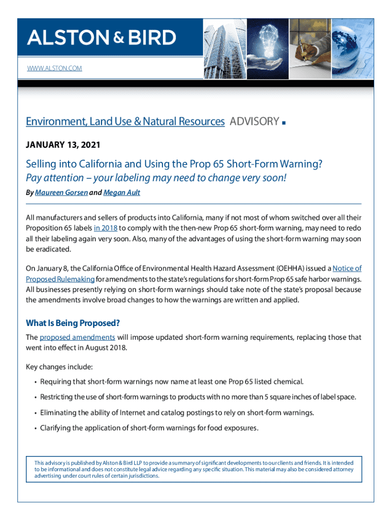 WWW.ALSTON.COMEnvironment, Land Use & Natural Resources ADVISORY n JANUARY 13, 2021Selling into California and Using the Prop 65 ShortForm Warning? Pay attention your labeling may need to change very