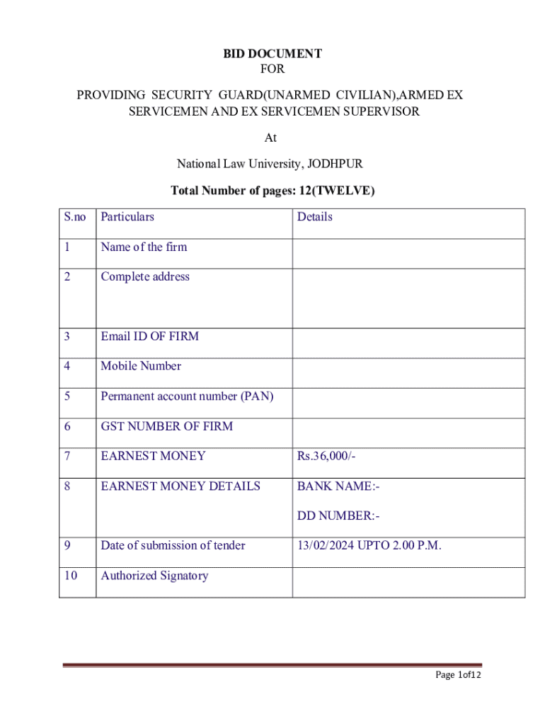 Get the free Bid Document for Providing Security Guard Services - nlujodhpur ac