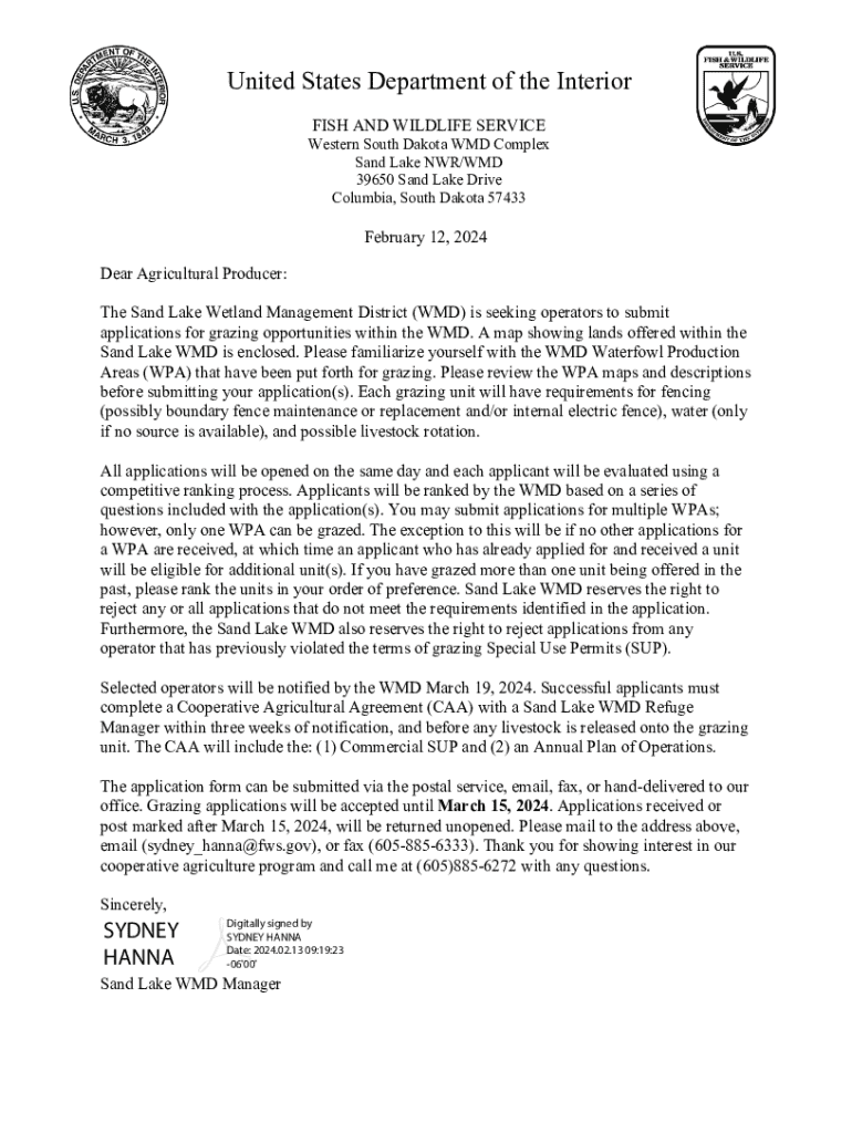 This form is for agricultural producers to apply for grazing opportunities within the Sand Lake Wetland Management District. Operators must familiarize themselves with the Waterfowl Production Areas (WPAs) offered for grazing and submit applications by the specified deadline.