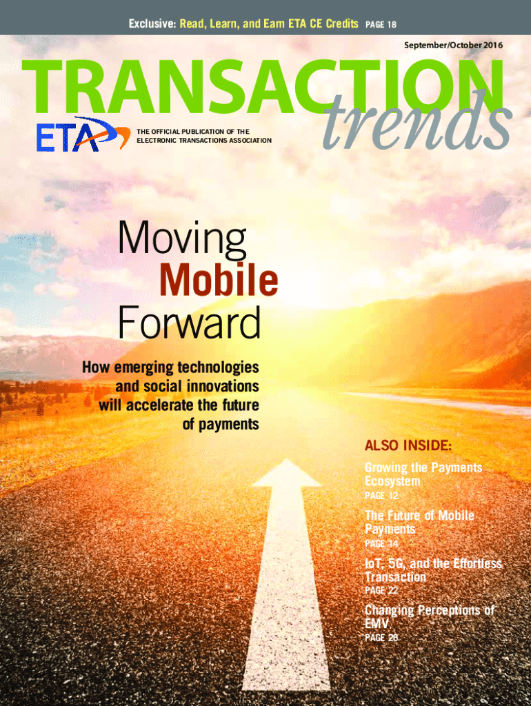 Exclusive: Read, Learn, and Earn ETA CE CreditsPAGE 18TRANSACTION trends September/October 2016THE OFFICIAL PUBLICATION OF THE ELECTRONIC TRANSACTIONS ASSOCIATIONMoving Mobile Forward How emerging technologies and social innovations will accelerate the future of payments ALSO INSIDE: Growing the Payments Ecosystem PAGE 12The Future of Mobile Payments PAGE 14IoT, 5G, and the Effortless Transaction PAGE 22Changing Perceptions of EMV PAGE 26Going to Money 2020? Visit us at Booth #2728 Join