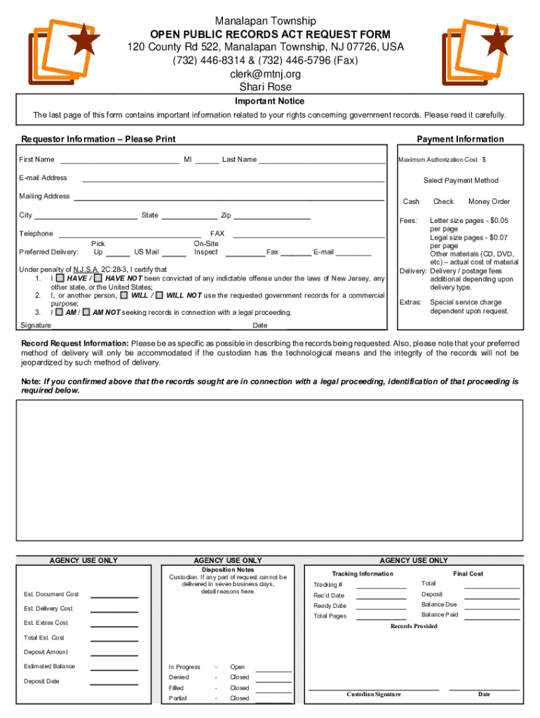 This form is used to request access to government records in accordance with the Open Public Records Act (OPRA) in New Jersey. It details the requestor\'s information, payment methods, delivery options, and certifies the requestor\'s eligibility under specific legal criteria. The form also provides guidelines regarding potential costs, exemptions, and procedures for appeal if access to records is denied.