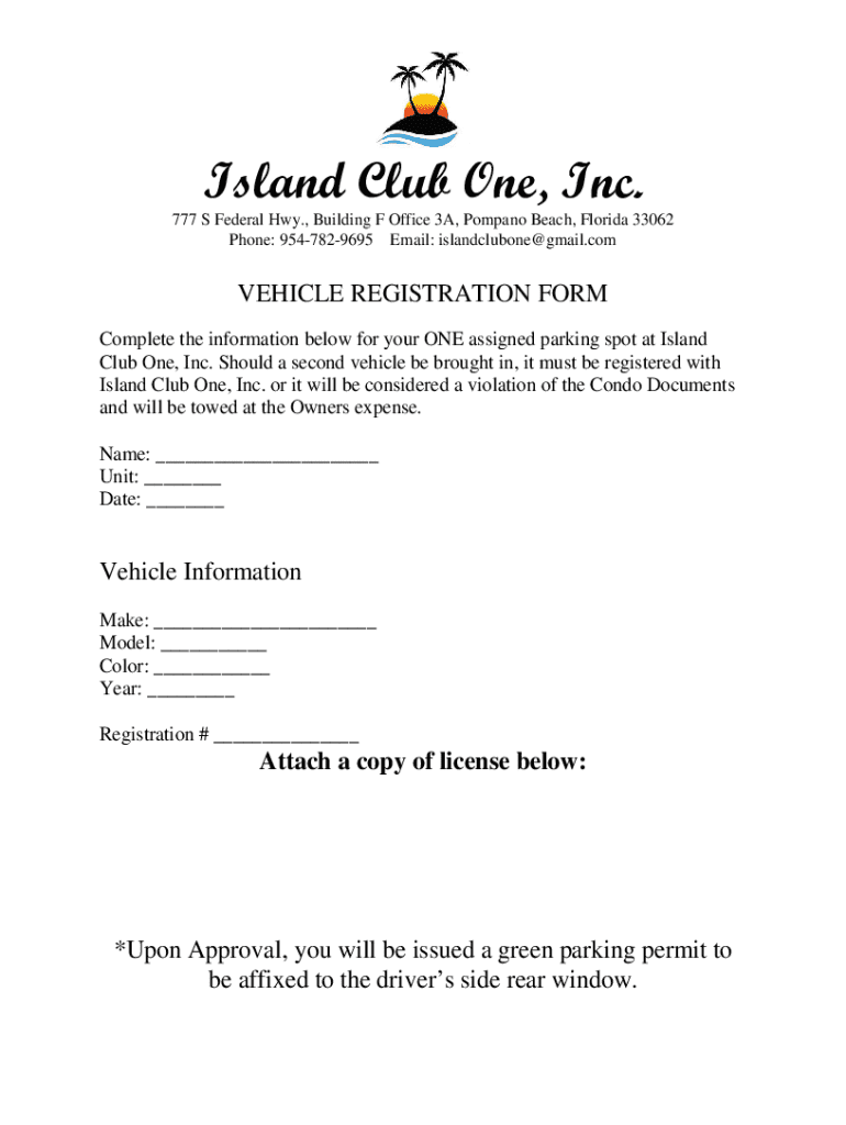 This form is used to register a vehicle for the designated parking spot at Island Club One, Inc. Owners must complete this form for their assigned parking spot and ensure that any additional vehicles are registered to avoid violations.
