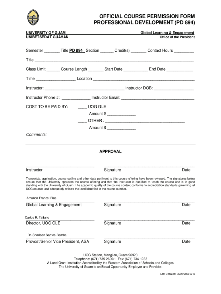 Este formulario es utilizado para obtener permiso oficial para inscribirse en el curso de desarrollo profesional PD 894 en la Universidad de Guam, que incluye detalles sobre el curso, instructor y aprobación.