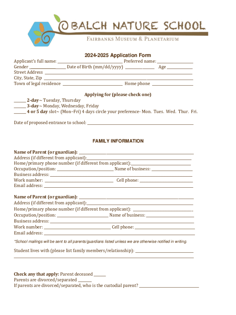 Este formulario de aplicación se utiliza para inscribir a los estudiantes en el Balch Nature School para el año escolar 2024-2025. Incluye secciones para la información del solicitante, la familia y preguntas sobre el estudiante.
