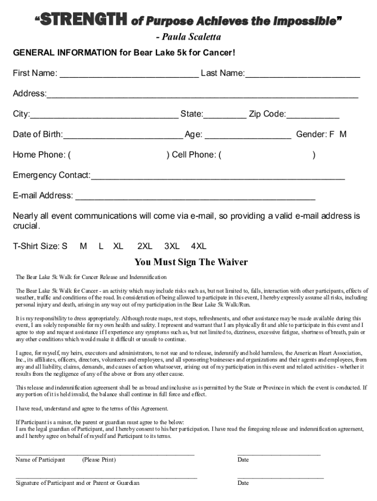 This form is for participants registering for the Bear Lake 5k Walk for Cancer event. It includes personal information, emergency contact details, and a waiver of liability.