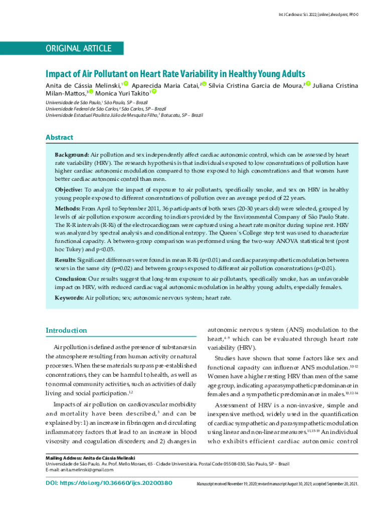 Int J Cardiovasc Sci. 2022; [online].ahead print, PP.00ORIGINAL ARTICLEImpact of Air Pollutant on Heart Rate Variability in Healthy Young Adults Anita de Cssia Melinski,1 Aparecida Maria Catai,2 MilanMattos,3 Monica Yuri Takito1Slvia Cristina Garcia de Moura,2Juliana CristinaUniversidade de So Paulo,1 So Paulo, SP Brazil Universidade Federal de So Carlos,2 So Carlos, SP Brazil Universidade Estadual Paulista Jlio de Mesquita Filho,3 Botucatu, SP BrazilAbstract Background: