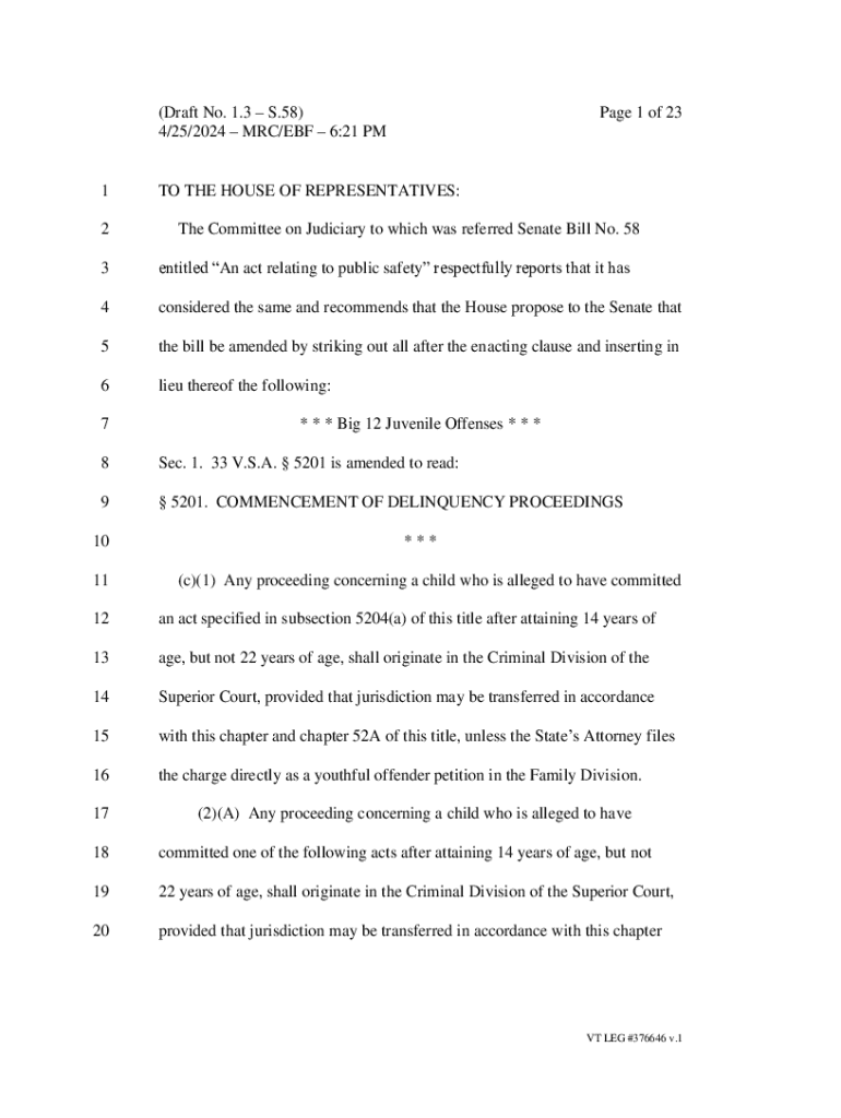 (Draft No. 1.3 S.58) 4/25/2024 MRC/EBF 6:21 PM1 2Page 1 of 23TO THE HOUSE OF REPRESENTATIVES: The Committee on Judiciary to which was referred Senate Bill No. 583entitled An act relating to public safety respectfully reports that it has4considered the same and recommends that the House propose to the Senate that5the bill be amended by striking out all after the enacting clause and inserting in6lieu thereof the following:7* * * Big 12 Juvenile Offenses * * *8Sec