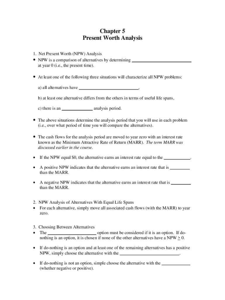 Chapter 5 Present Worth Analysis 1. Net Present Worth (NPW) Analysis NPW is a comparison of alternatives by determining ___ at year 0 (i.e., the present time). At least one of the following three situations will characterize all NPW problems: a) all alternatives have ___, b) at least one alternative differs from the others in terms of useful life spans, c) there is an ___ analysis period. The above situations determine the analysis period that you will use in each problem (i.e., over