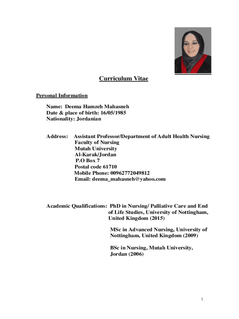 Curriculum Vitae Personal Information Name: Deema Hamzeh Mahasneh Date & place of birth: 16/05/1985 Nationality: Jordanian Address:Assistant Professor/Department of Adult Health Nursing Faculty of