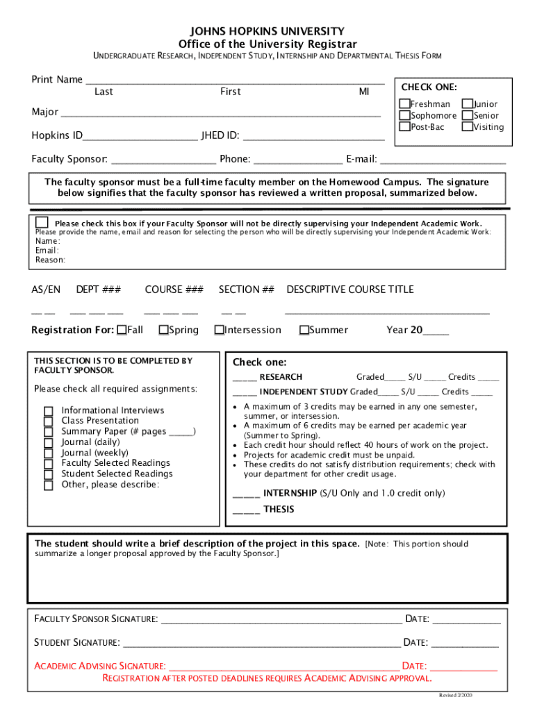 Este formulario es utilizado por los estudiantes de la Universidad Johns Hopkins para registrar estudios independientes, investigaciones, pasantías y tesis departamentales, con la aprobación de