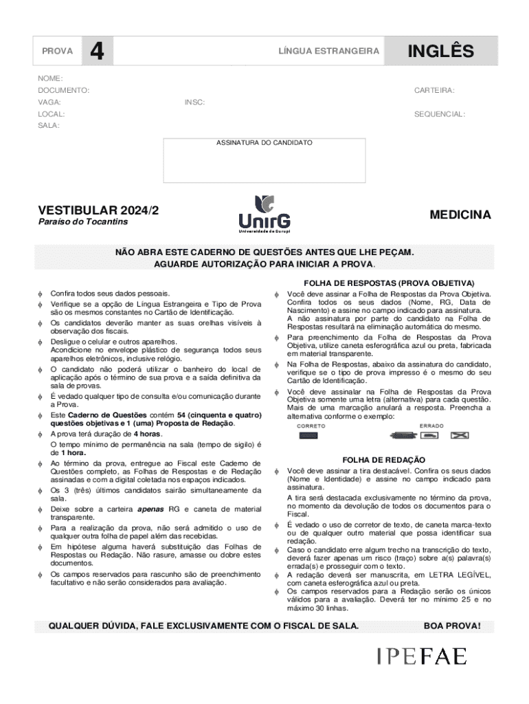 PROVA4LNGUA ESTRANGEIRAINGLSNOME: DOCUMENTO:CARTEIRA:VAGA:INSC:LOCAL:SEQUENCIAL:SALA: ASSINATURA DO CANDIDATOVESTIBULAR 2024/2MEDICINAParaso do TocantinsNO ABRA ESTE CADERNO DE QUESTES ANTES QUE LHE