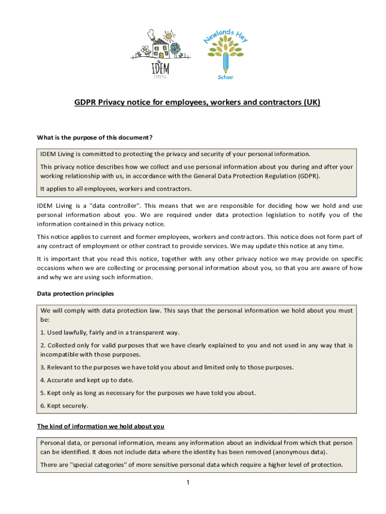 This privacy notice explains how IDEM Living collects, uses, and protects personal information of employees, workers, and contractors in accordance with the General Data Protection Regulation (GDPR). It outlines the types of personal data collected, the purposes of data processing, and the rights of individuals regarding their personal information.