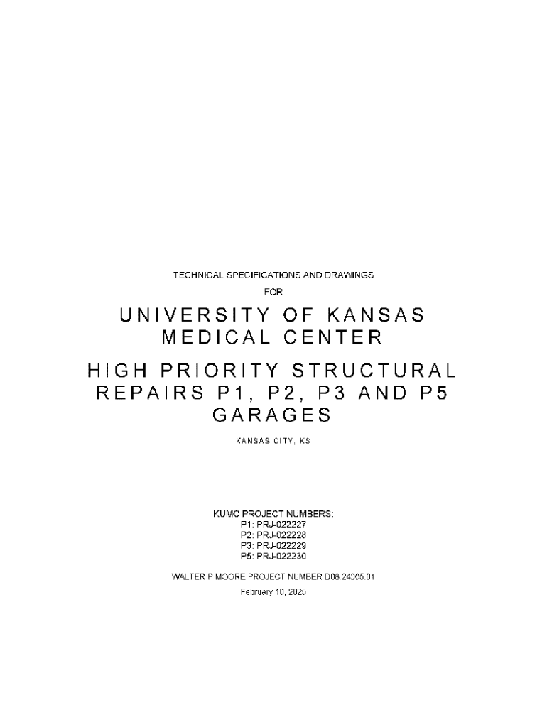 TECHNICAL SPECIFICATIONS AND DRAWINGS FORUNIVERSITY OF KANSAS MEDICAL CENTER HIGH PRIORITY STRUCTURAL REPAIRS P1, P2, P3 AND P5 GARAGES KANSAS CITY, KSKUMC PROJECT NUMBERS: P1: PRJ022227 P2: PRJ022228 P3: PRJ022229 PS: PRJ022230 WALTER P MOORE PROJECT NUMBER 008.24005.01 February 10, 2025TECHNICAL SPECIFICATIONS AND DRAWINGS FOR UNIVERSITY OF KANSAS MEDICAL CENTER HIGH PRIORITY STRUCTURAL REPAIRS Pl, P2, P3 AND PS GARAGES KANSAS CITY, KSWALTER P. MOORE AND ASSOCIATES, INC. 1100 Walnut