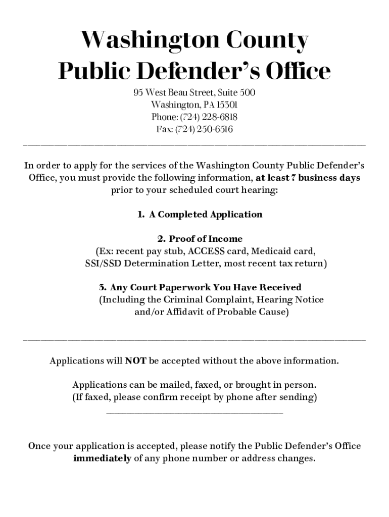 Individuals who are charged with a crime and cannot afford to hire a private attorney are required to file for a Washington County Public Defender.