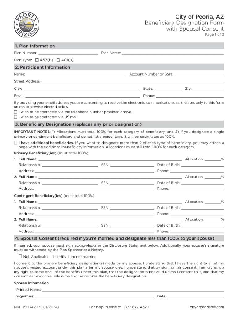 Este formulario permite designar beneficiarios para planes de jubilación y requiere el consentimiento del cónyuge si no se designa al cónyuge como beneficiario principal en su totalidad.