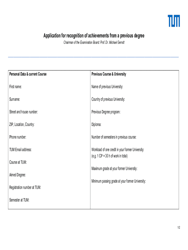 Formular zur Beantragung der Anerkennung von Studienleistungen aus einem vorherigen Studiengang an der Technischen Universität München.