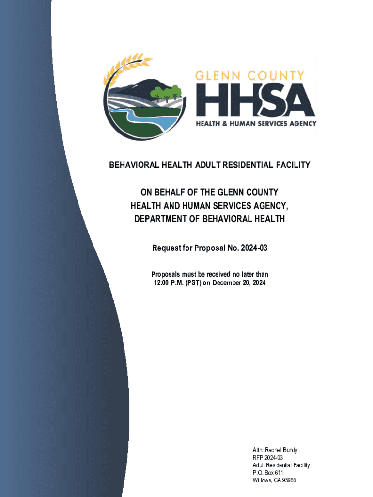 Glenn County is inviting proposals from qualified organizations specializing in behavioral health services to develop and deliver residential behavioral health services for individuals experiencing homelessness. The proposals must describe various models of service provision, including long-term living options, Board and Care, and Transitional Housing.