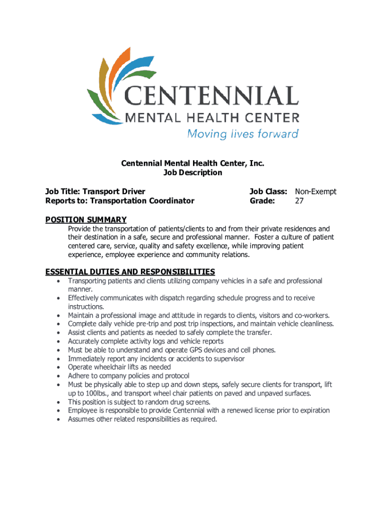Centennial Mental Health Center, Inc. Job Description Job Title: Transport Driver Reports to: Transportation CoordinatorJob Class: Grade:NonExempt 27POSITION SUMMARY Provide the transportation of
