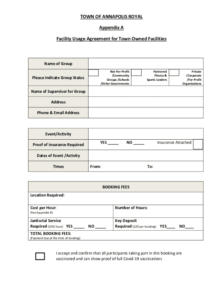 This agreement outlines the terms for the use of facilities owned by the Town of Annapolis Royal, including requirements for insurance, booking fees, and liability. It requires confirmation of vaccination status for participants and includes fields for group details and event information.