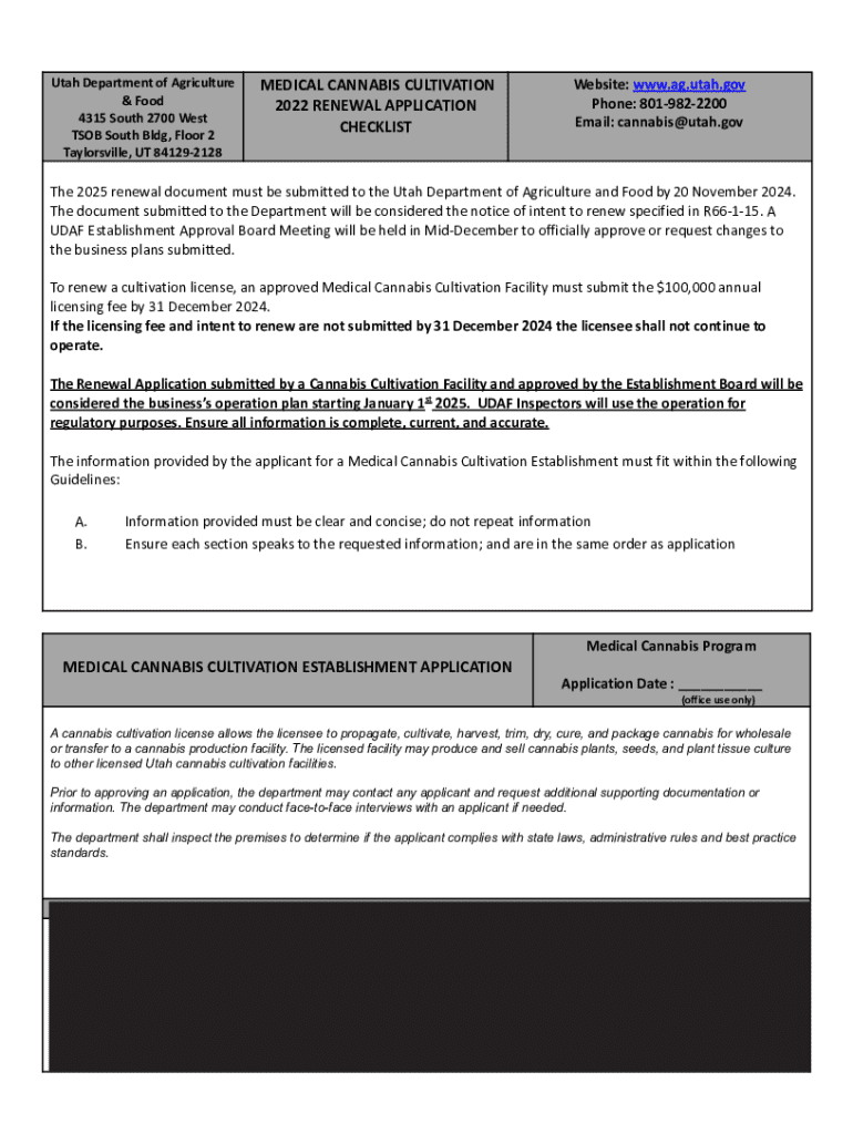 This document outlines the requirements and process for renewing a medical cannabis cultivation license in Utah. It specifies the necessary submissions, deadlines, and guidelines for applicants seeking