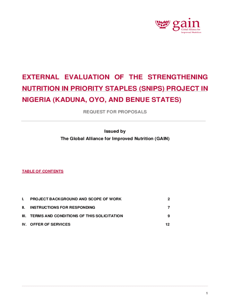 EXTERNAL EVALUATION OF THE STRENGTHENING NUTRITION IN PRIORITY STAPLES (SNIPS) PROJECT IN NIGERIA (KADUNA, OYO, AND BENUE STATES) REQUEST FOR PROPOSALSIssued by The Global Alliance for Improved Nutrition