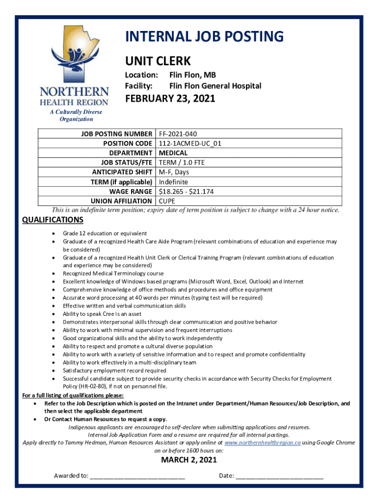 Job posting for an indefinite term position as a Unit Clerk at Flin Flon General Hospital with specific qualifications required, including education and skills in healthcare and administrative support.