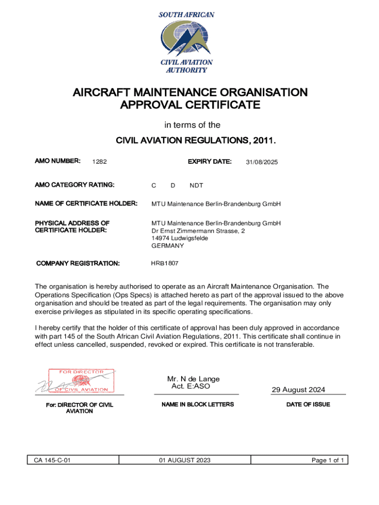 This document certifies that MTU Maintenance Berlin-Brandenburg GmbH is approved as an Aircraft Maintenance Organisation in accordance with the Civil Aviation Regulations, 2011. It includes operational specifications and defines the scope of maintenance work authorized for the organization.