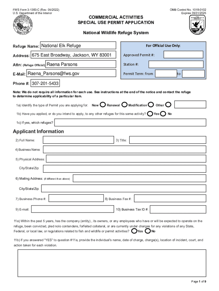 Este formulario es una solicitud para un permiso especial de uso comercial dentro del Sistema de Refugios Nacionales de Vida Silvestre. Los solicitantes deben proporcionar información sobre su actividad comercial y cumplir con ciertos requisitos regulatorios.