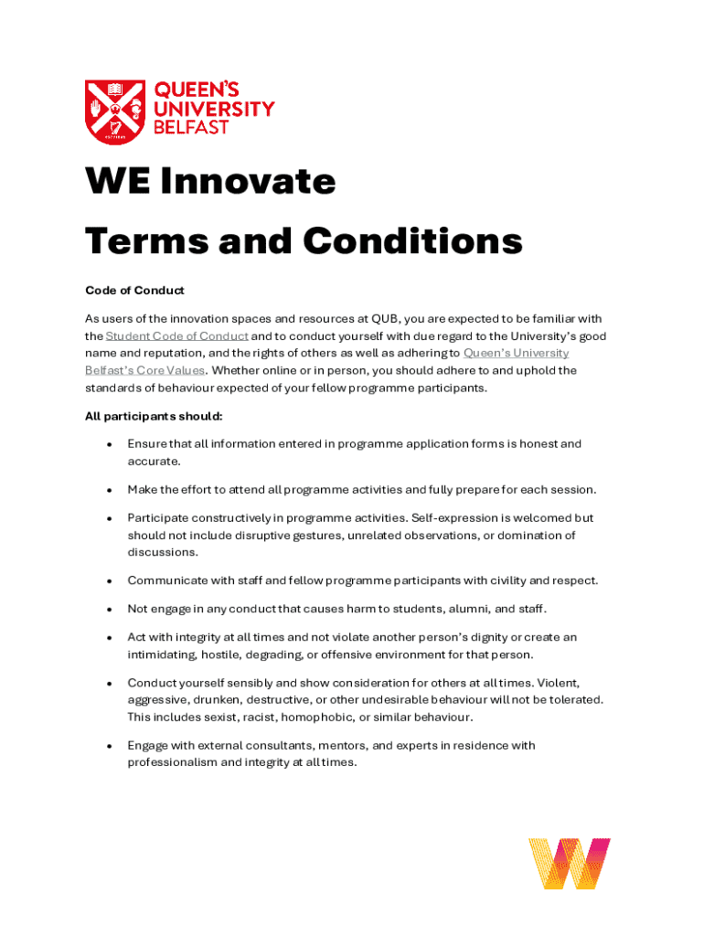WE Innovate Terms and Conditions Code of Conduct As users of the innovation spaces and resources at QUB, you are expected to be familiar with the Student Code of Conduct and to conduct yourself with due regard to the Universitys good name and reputation, and the rights of others as well as adhering to Queens University Belfasts Core Values. Whether online or in person, you should adhere to and uphold the standards of behaviour expected of your fellow programme participants. All participants