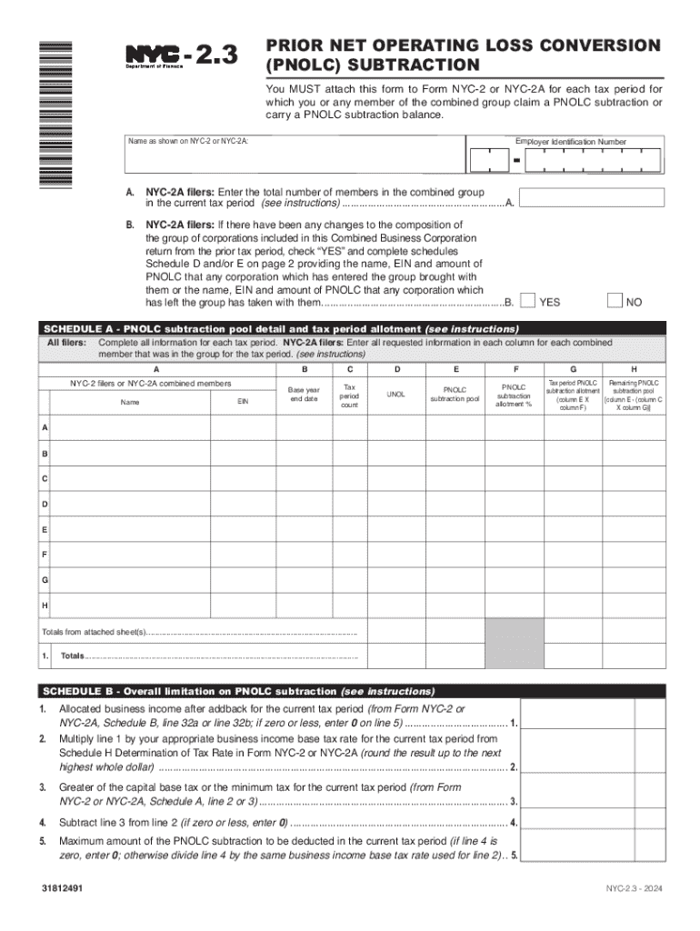 This form is required to be attached to Form NYC-2 or NYC-2A for each tax period for members of the combined group claiming a PNOLC subtraction or carrying a PNOLC subtraction balance. It includes detailed schedules for reporting PNOLC subtractions and associated tax computations.