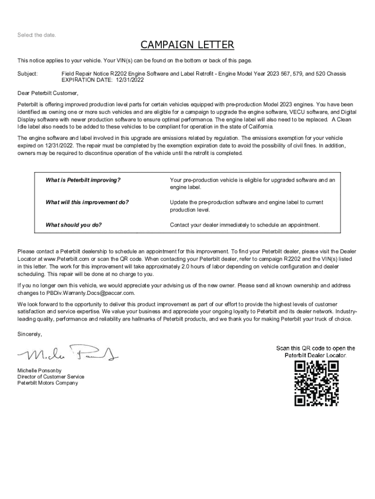 Este aviso se aplica a su vehículo. Peterbilt ofrece piezas de nivel de producción mejoradas para ciertos vehículos equipados con motores modelo 2023 de preproducción. Este documento se trata