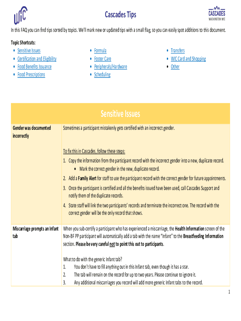 Cascades Tips In this FAQ you can find tips sorted by topics. Well mark new or updated tips with a small flag, so you can easily spot additions to this document. Topic Shortcuts: Sensitive Issues Certification and Eligibility Food Benefits Issuance Food Prescriptions Formula Foster Care Peripherals/Hardware Scheduling Transfers WIC Card and Shopping OtherSensitive Issues Gender was documented incorrectlySometimes a participant mistakenly gets certified with an incorrect gender