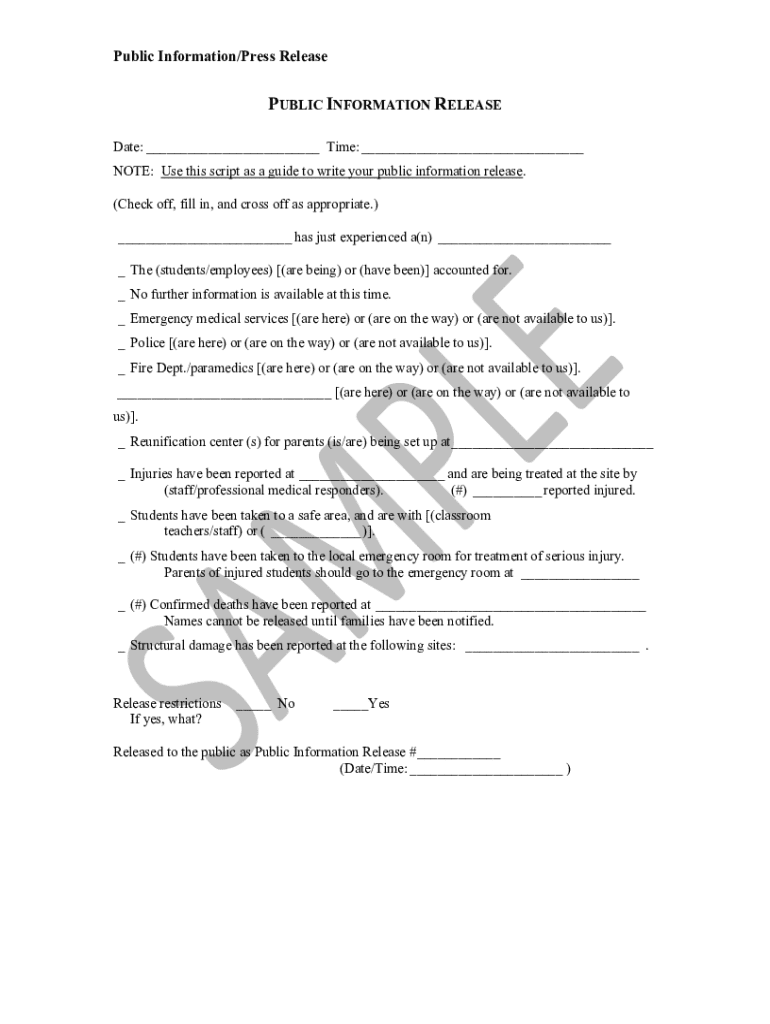 This document serves as a template for writing a public information release in the event of an incident, providing essential details such as the date, time, account of the incident, and information about the availability of emergency services and reunification centers for parents.