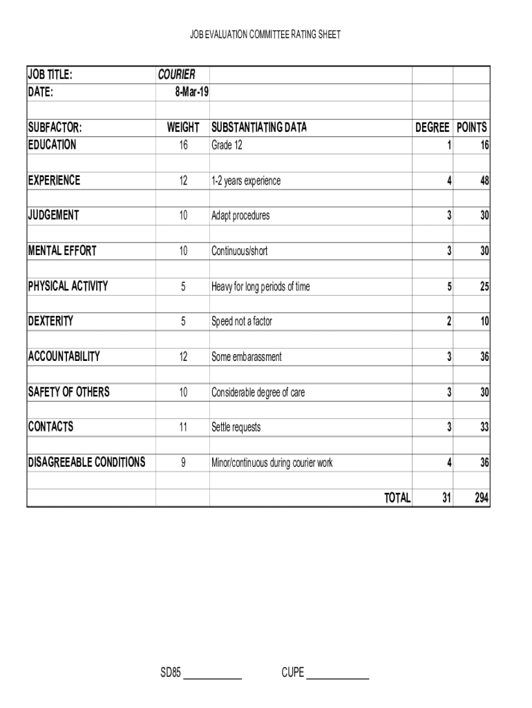 This document is used for evaluating job positions based on various factors such as education, experience, and physical activity. Each subfactor is assigned a weight and points based on the evaluation
