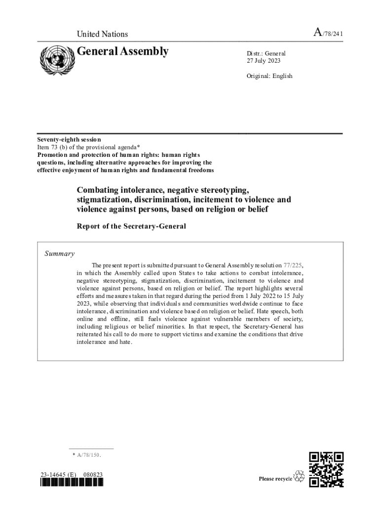 This report discusses the promotion and protection of human rights with a focus on combating intolerance, negative stereotyping, stigmatization, discrimination, incitement to violence, and violence