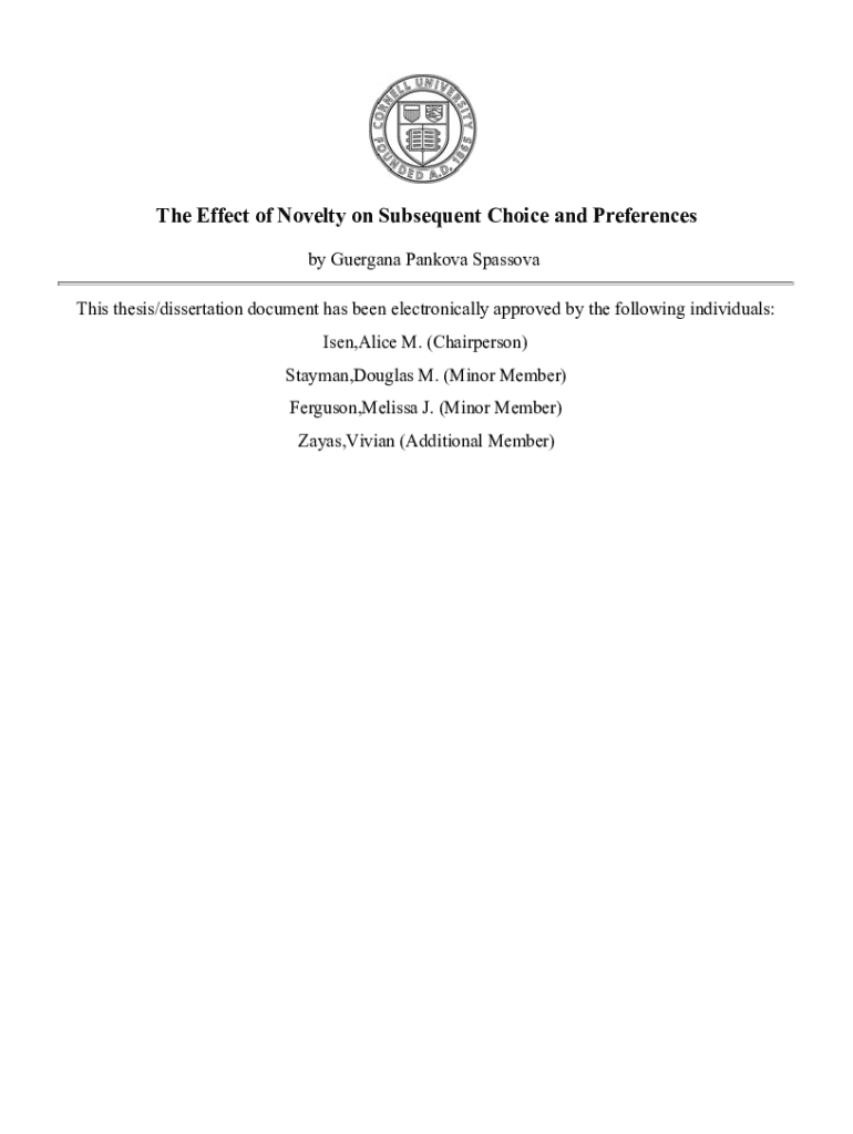 The Effect of Novelty on Subsequent Choice and Preferences by Guergana Pankova Spassova This thesis/dissertation document has been electronically approved by the following individuals: Isen,Alice M. (Chairperson) Stayman,Douglas M. (Minor Member) Ferguson,Melissa J. (Minor Member) Zayas,Vivian (Additional Member)THE EFFECT OF NOVELTY ON SUBSEQUENT CHOICE AND PREFERENCESA Dissertation Presented to the Faculty of the Graduate School of Cornell University In Partial Fulfillment of the Requirements