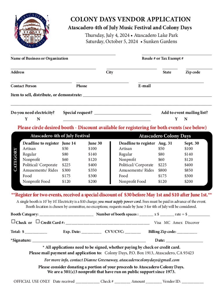 Application form for vendors wishing to participate in the Atascadero 4th of July Music Festival and Colony Days, detailing registration deadlines, booth categories, fees, and requirements.