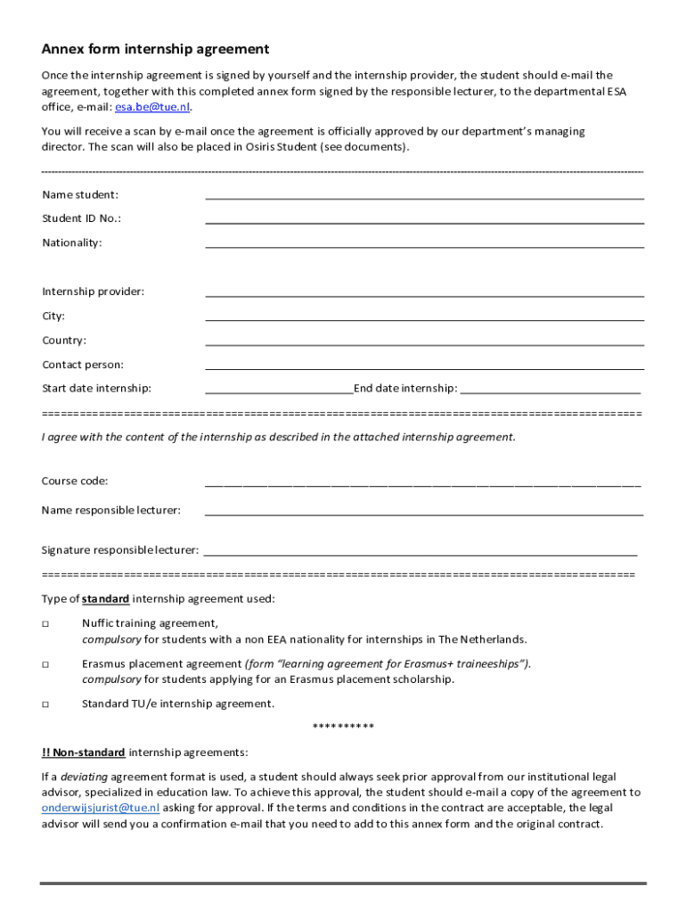 This annex form is to be completed and signed by the responsible lecturer after the internship agreement is signed. It must be emailed alongside the internship agreement to the departmental ESA office. The document includes sections for student information, internship provider details, and agreement confirmation.